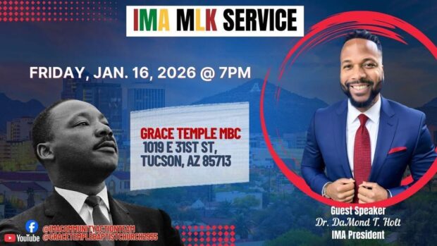 The International Ministerial Alliance MLK Service is on Friday, January 16th, at 7:00 pm, hosted at Grace Temple MBC, 1019 E. 31st Street, Tucson, Arizona. The service features special guest speaker Dr. DaMond T. Holt, IMA President, honoring the legacy of Dr. Martin Luther King, Jr. and his impact on justice, equality, and community unity. For more details, visit @IMACommunityActionTeam on Facebook.