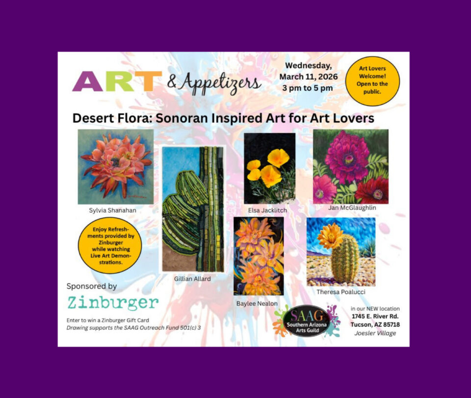 At the March Art and Appetizers, SAAG artists, who have been inspired by the Sonoran Desert, will demonstrate their techniques – alcohol inks, painting, mosaics. Appetizers provided courtesy of Zinburger. Wednesday, March 11, 3-5pm. Joesler Village, 1745 East River Road(next to Villa Peru). This is a free event.