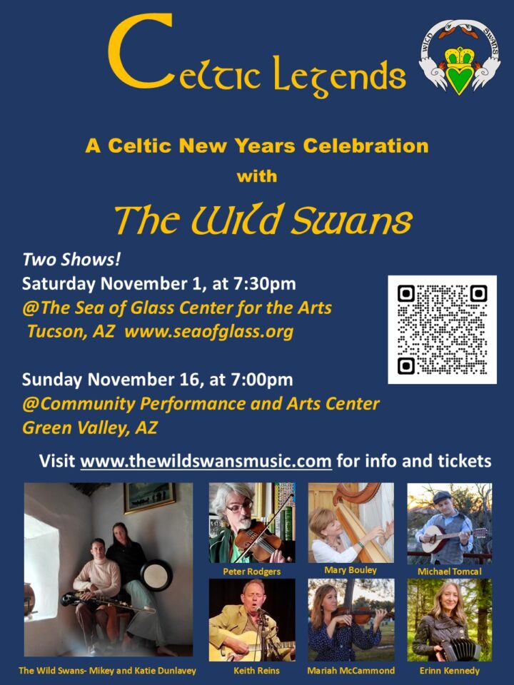 Join The Wild Swans and special guests for Celtic Legends! A Celtic New Year Celebration featuring songs, stories and poems of Irish folklore and fairy tales. The Wild Swans present two concerts Saturday, November 1st, 2025 at 7:30pm at The Sea of Glass in Tucson, AZ and Sunday, November 16th at 7pm at The Community Performance and Arts Center in Green Valley, AZ.