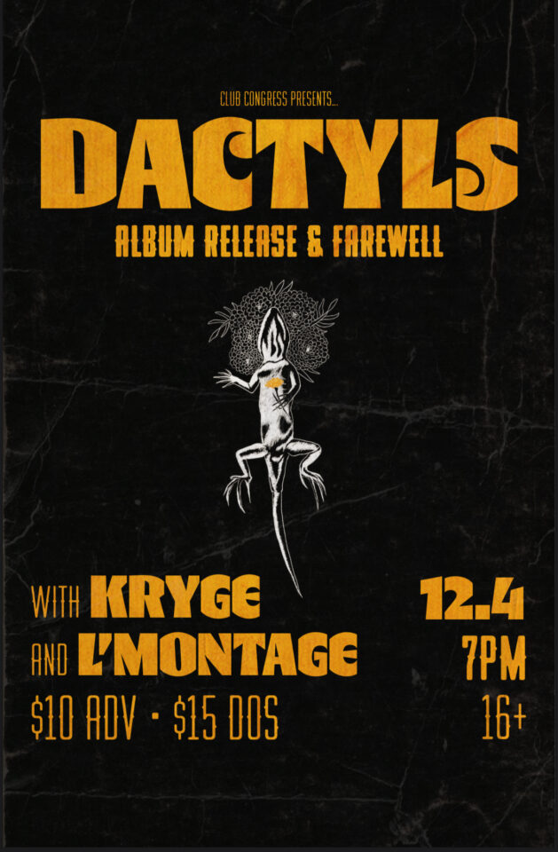 Supported by local bands Kryge and L’Montage. Dactyls is an instrumental experimental jazz band. Think indie-rock inspired shoegaze with a jazz edge. We’d love to share our first album with you!