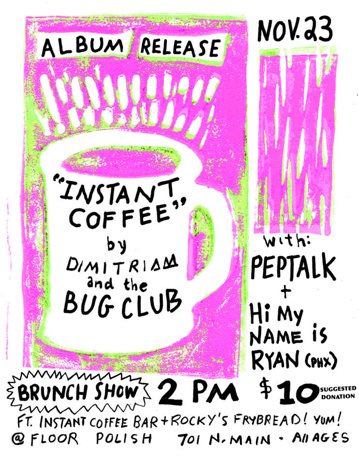 Album Release party for “Instant Coffee” by Dimitriam and the Bug Club. the album was released on cassette by Related Records. Early afternoon show 2pm Sunday Nov 23rd at Floor Polish Dance Studio (930 N Stone Ave). All ages and open to all, $10 suggested donation. Instant coffee bar and Rocky’s Frybread will be available for purchase, but fee free to bring your own snacks and drinks 🙂