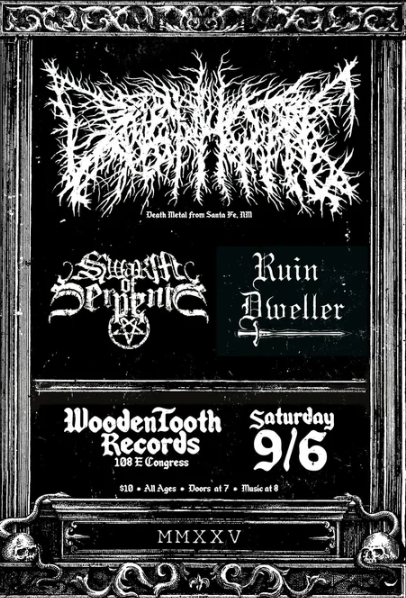 Death metal bands Dysphotic (Santa Fe, NM) Swam of Serpents (Tucson) and Ruin Dweller (Madison, WI) take the stage. All ages show, bar with ID, $10