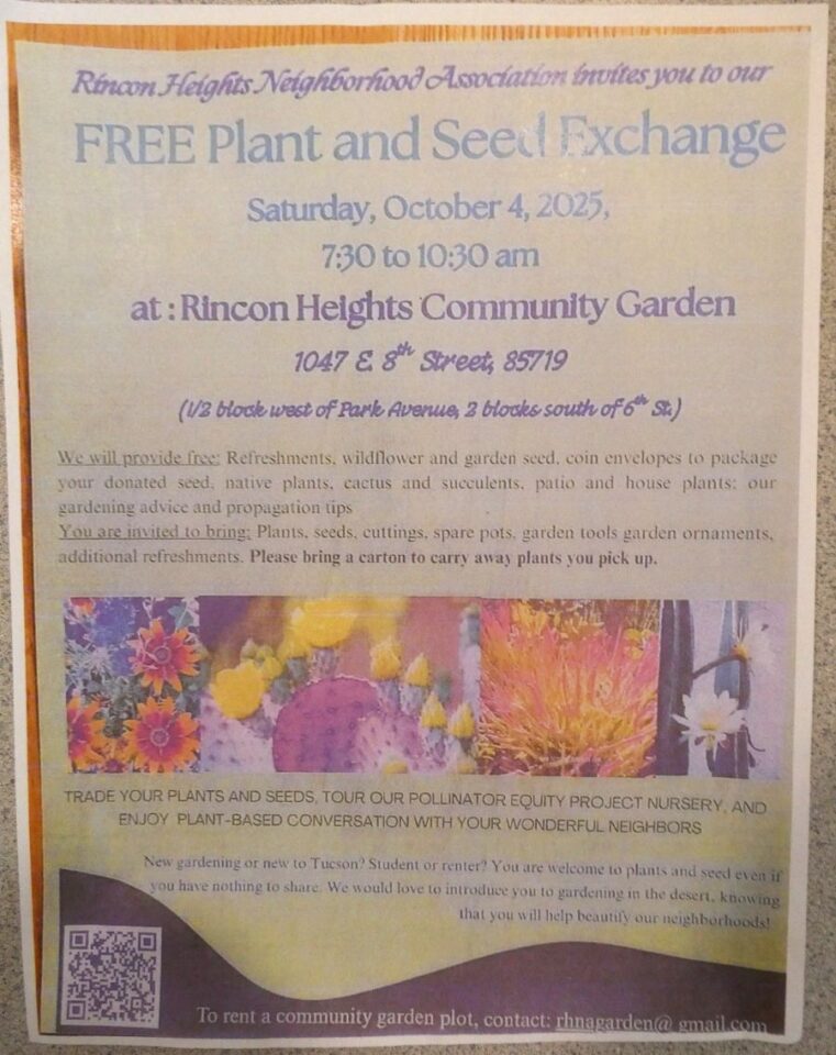 Donate/exchange/pick-up free plants, seeds, gardening supplies at the Rincon Heights Community Garden 1047 E 8th St. Tour our garden and get free gardening advice and tips.