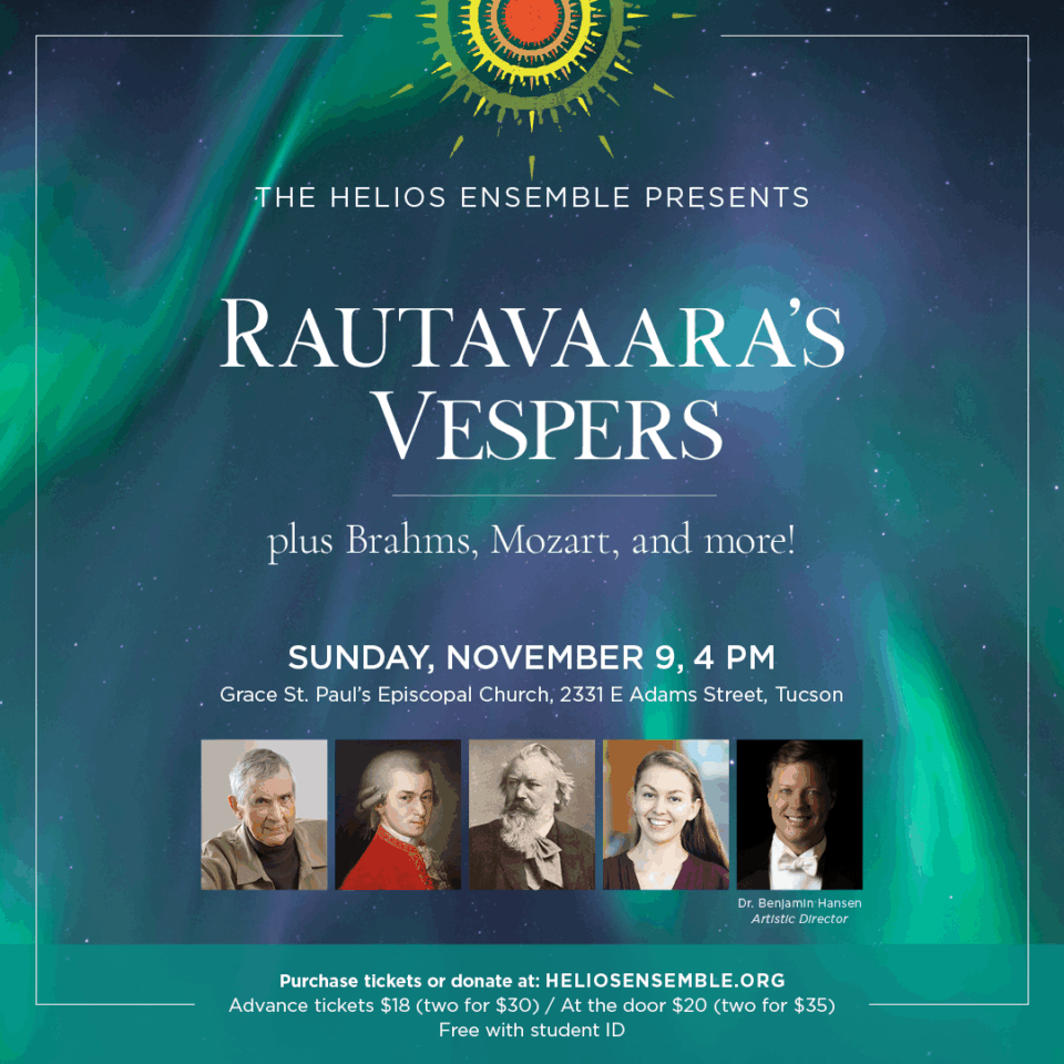 The Helios Ensemble will premiere Rautavaara’s ‘Vespers’ a Finnish choral piece, on Sunday, November 9 2025 at 4 PM