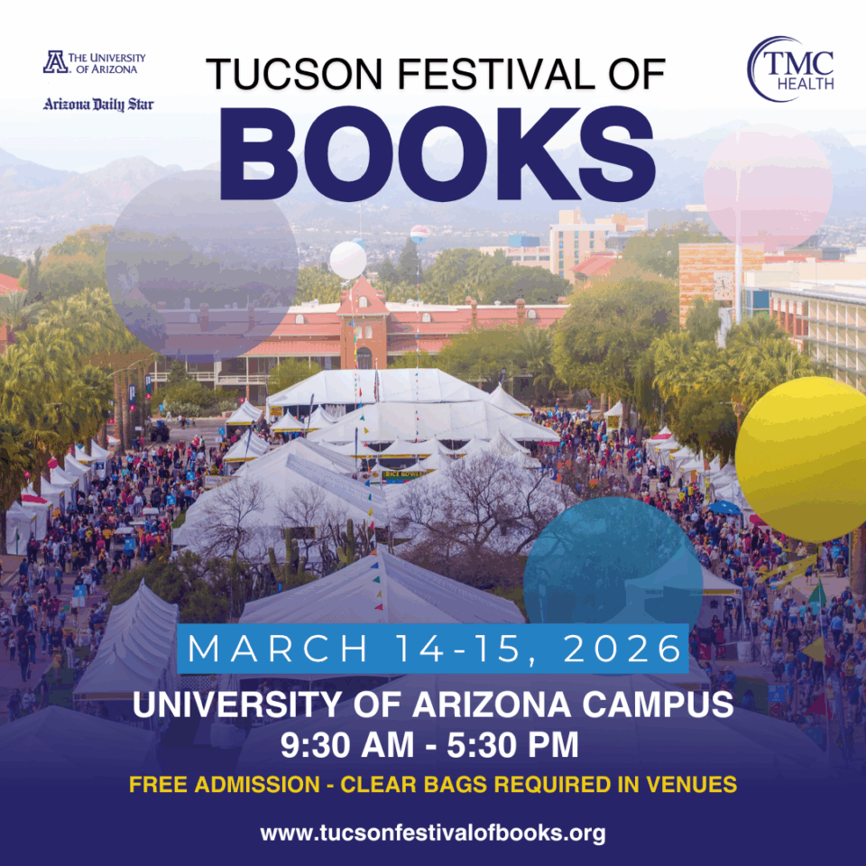 The Tucson Festival of Books is a free-to-attend, community-wide celebration of literature March 14-15, 2026 from 9:30 a.m. to 5:30 p.m.. Festival activities include both large and small author panels and workshops on various literary topics. The festival features dozens of entertainers, plus hundreds of local and national exhibitors with literacy-focused booths and activities. Attendees can meet their favorite authors, purchase books and book-themed merchandise, enjoy local musicians and other entertainers, and much more.