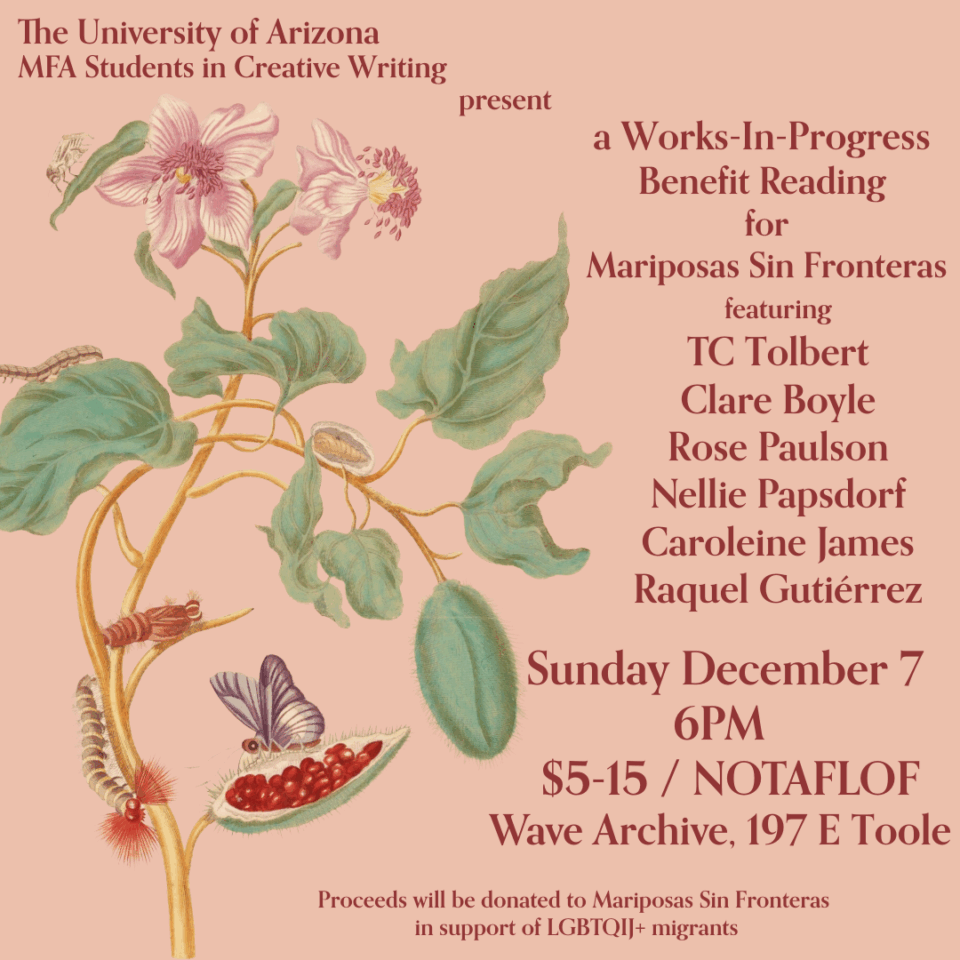 Please join us for a night of poetry, prose, and pastries in support of Mariposas Sin Fronteras, an abolitionist organizaton supporting LGBTQIJ+ migrants in & recently released from detention centers. Suggested donation $5-$15, NOTAFLOF (no one turned away for lack of funds). Readers: Tucson Poet Laureate TC Tolbert, Clare Boyle, Rose Paulson, Nellie Papsdorf, Caroleine James, and Raquel Gutiérrez.