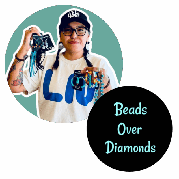 Josie shares her story about how she learned and practiced beading at a young age while doing volunteer work at the Tucson Indian Center where they provided a good creative-social environment to do crafts for people of all ages. It was then that she first started doing bead work and was a fast learner, to which she eventually started offering individual attention and constructive feedback to others. Today, she has her own workspace likely equipped with pliers, needles, bead mats, and various types of stringing material, creating handcrafted beaded jewelry for her own business called Beads Over Diamonds.