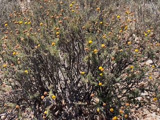 I mention that the US Soil Conservation Service introduced and used Pentzia incana for erosion control back in the 1930s. And, I remembered that in 1980 at my first nursery gig, karoo bush was in the horticulture trade. Back then I thought that it was a pretty plant. Well, it is a pretty plant, but hello, if it spreads from seed into native habitat then that’s not good. Go native, Mister Mesquitey!